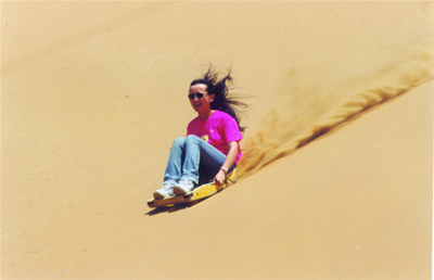 ? ? ? ? ?滑沙,即乘坐滑板從高高的沙山頂自然下滑,滑板用木質(zhì)、竹子、塑料等材料制成,坐在滑沙板上,兩手撐在板壁上,雙腳蹬住前沿,身體微向前傾,下滑時(shí)隨著沙山的坡度加大和下滑速度的加快,頓覺兩耳生風(fēng),轉(zhuǎn)眼之間就沖到了山下,在有驚無險(xiǎn)的瞬間體味到了刺激與快感?;郴榔露纫话銥?5°,游客乘滑沙板以每秒20米的速度下滑,隨著慣性的加大,速度越來越快,驚險(xiǎn)刺激又絕對(duì)安全。滑沙運(yùn)動(dòng)類似滑雪和旱地雪橇,需要勇氣和膽量。是草原上非常刺激的深得游客喜愛的娛樂休閑運(yùn)動(dòng)。