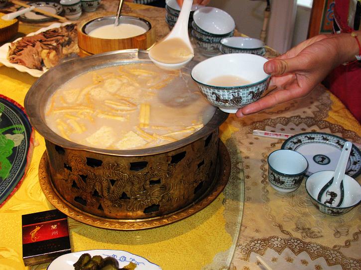牧民喝奶茶時,還要泡著吃些炒米、黃油、奶豆腐和手把肉,這樣既能溫暖肚腹,抵御寒冷的侵襲,又能夠幫助消化肉食,還能補(bǔ)充因吃不到蔬菜而缺少的維生素。所以,在牧區(qū)有一句俗話說:“寧可一日無食,不可一日無茶”。的確,蒙古族牧民的一天就是從喝奶茶開始的。這種嗜好在蒙古族是作為一種歷史文化表現(xiàn)延續(xù)至今。當(dāng)你每天早晨吃早點(diǎn)的時候,新老朋友擁壺而坐,一面細(xì)細(xì)品嘗令人飴情清心的奶茶,品嘗富有蒙古民族特點(diǎn)的炒米、奶油和糕點(diǎn),一面談心,論世事,喝得鼻尖冒出了汗,正是體現(xiàn)了俗話所說:“有茶之家何其美”的景象。假如你有機(jī)會來內(nèi)蒙古自治區(qū)做客,可以品嘗純正美味的奶茶、奶食品,享受這種歷史文化帶給人們的樂趣。當(dāng)然在蒙古包里就更是別有一番情趣了。