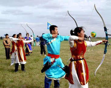 蒙古箭的弓身用竹片制成,竹片內(nèi)襯角兒,兩角相接處是堅(jiān)木做成的把兒。弓的兩端以皮筋為弦拉緊。箭長(zhǎng)約l米,以柳條做成,鷹羽作尾。箭頭用金屬或牛角做成。箭靶是用五種不同顏色涂成的氈片靶,靶心是活動(dòng)的,射中后靶心就可掉下來(lái)。